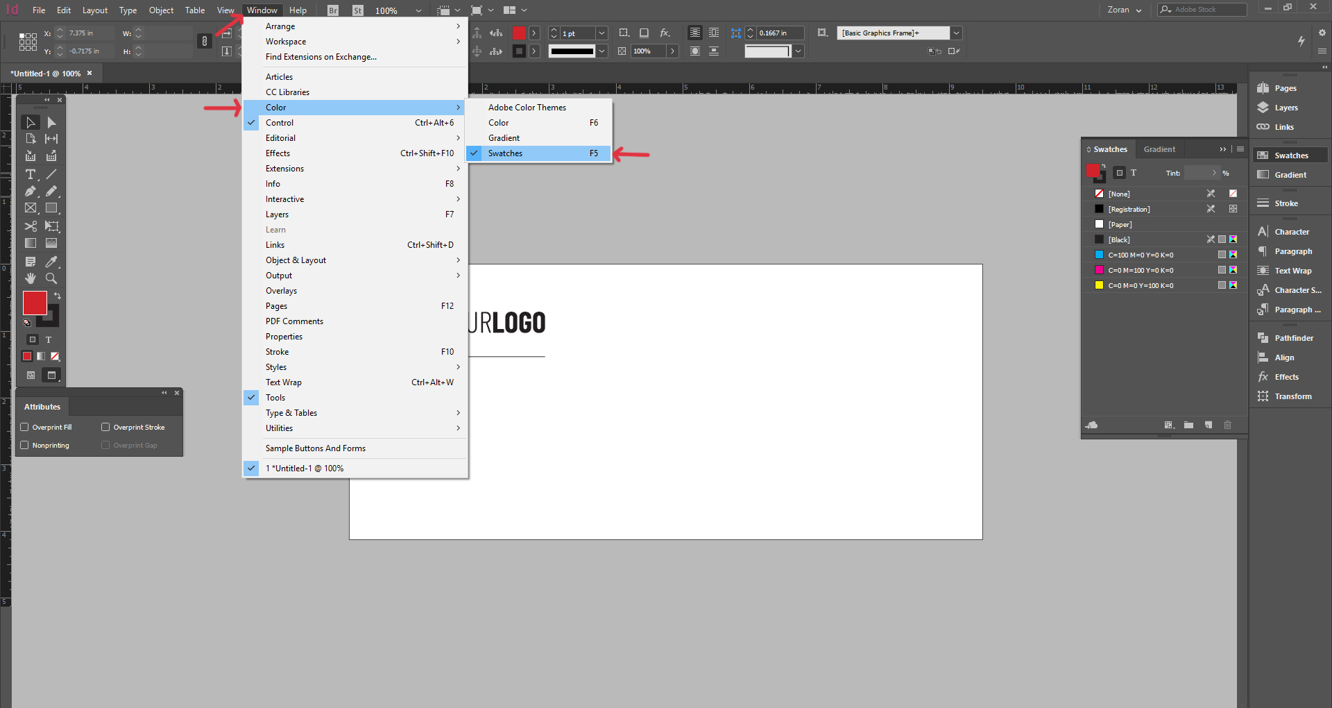 In order to apply Pantone colours to your design, you will need to use the Swatches palette. To make this palette visible, go to Window / Color / Swatches.