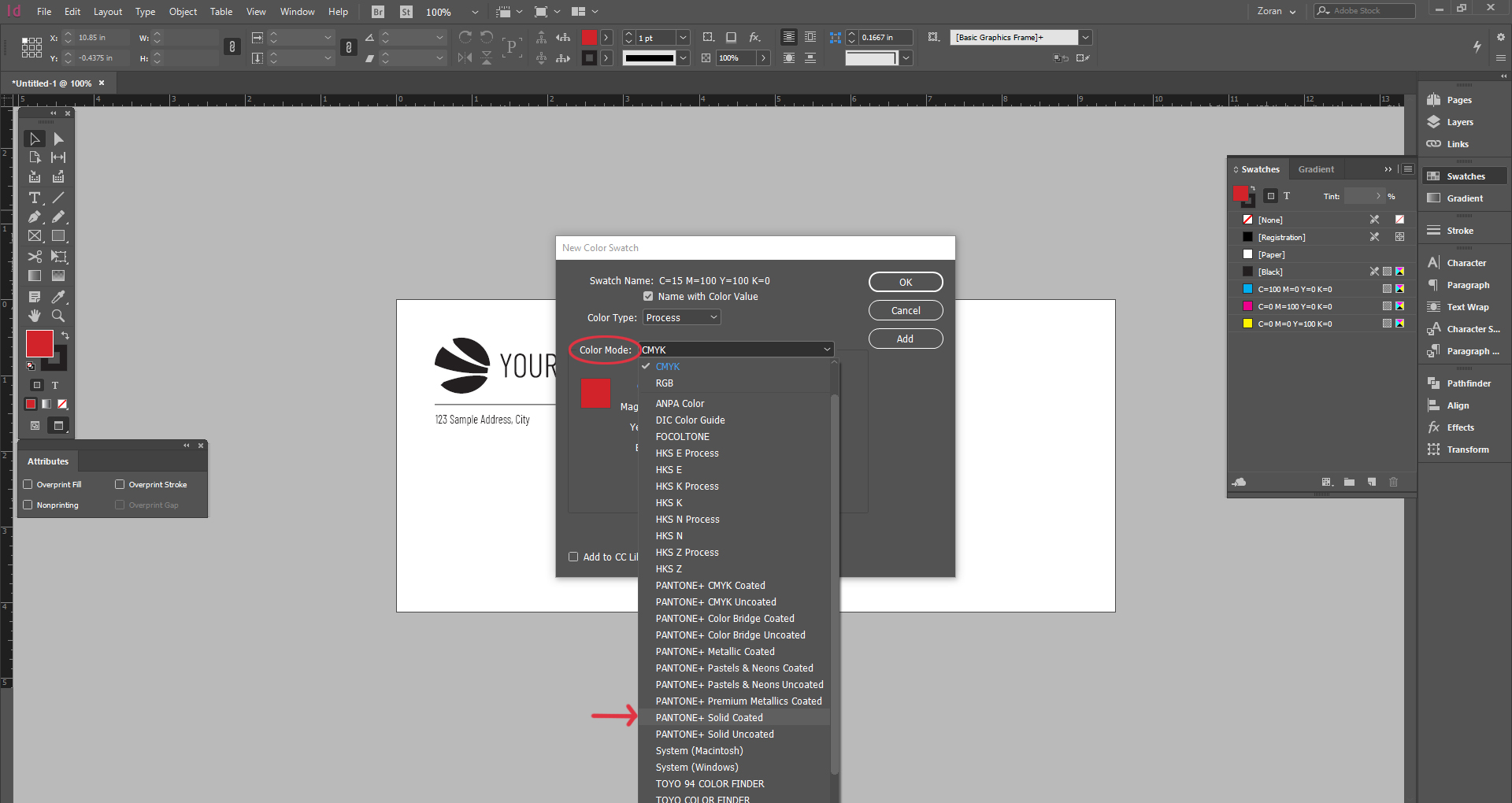 A New Color Swatch window will pop up. Once you click the Color Mode drop-down menu, you will be able to choose the Pantone colour book that you need. Most commonly used are Pantone+ Solid Coated and Pantone+ Solid Uncoated.