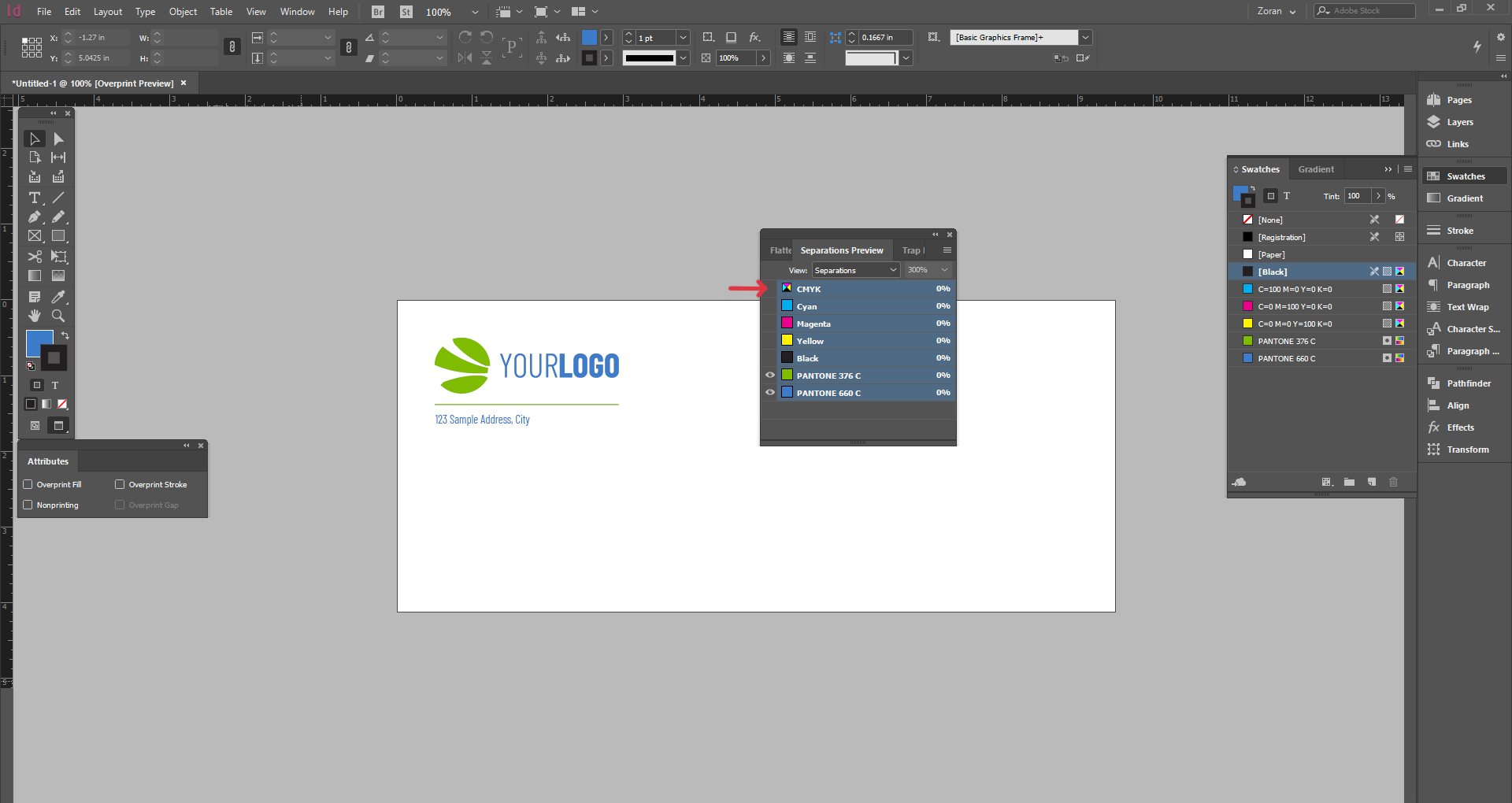 3. Turn off the visibility of CMYK colours so only the Pantone colours are visible. If nothing changes in your design once you turn off the visibility of CMYK colours, that means only Pantone colours are used in your design.